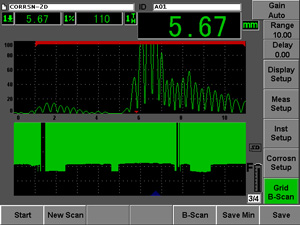 腐蝕模塊還包含一個(gè)時(shí)控B掃描視圖。這個(gè)B掃描的采集基于單個(gè)回波或來(lái)自回波到回波測(cè)量。B掃描可以為最多3個(gè)用戶定義的厚度范圍顯示彩色編碼。B掃描用于快速采集潛在缺陷區(qū)域的數(shù)據(jù)并制作綜合性報(bào)告。