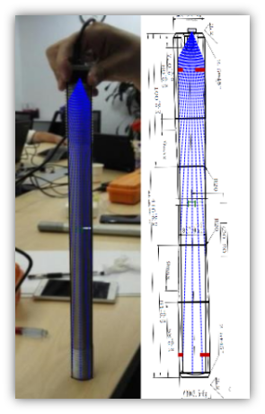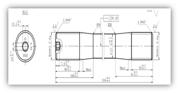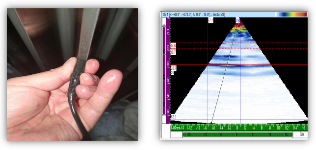 我們對(duì)有圖所示螺栓工件進(jìn)行檢測(cè),使用扇掃描的檢測(cè)結(jié)果如下,螺栓中預(yù)埋的裂紋類缺陷清晰可見。