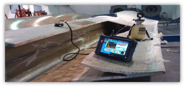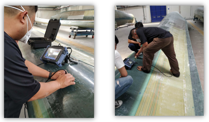 對(duì)于傳統(tǒng)的UT檢測(cè)來說,玻璃纖維結(jié)構(gòu)穿透性非常差,需要極低頻率的探頭才能夠穿透工件,地面的不平整和支撐梁的信號(hào)干擾,對(duì)常規(guī)超聲檢測(cè)影響非常大;