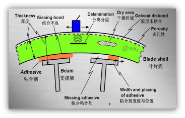 在風(fēng)電葉片檢測(cè)中,內(nèi)部分層,脫粘等缺陷是影響其壽命的重要因素,因而PT這樣的表面檢測(cè)手段使用有限,而且這類缺陷,RT對(duì)其反應(yīng)也極其不敏感;