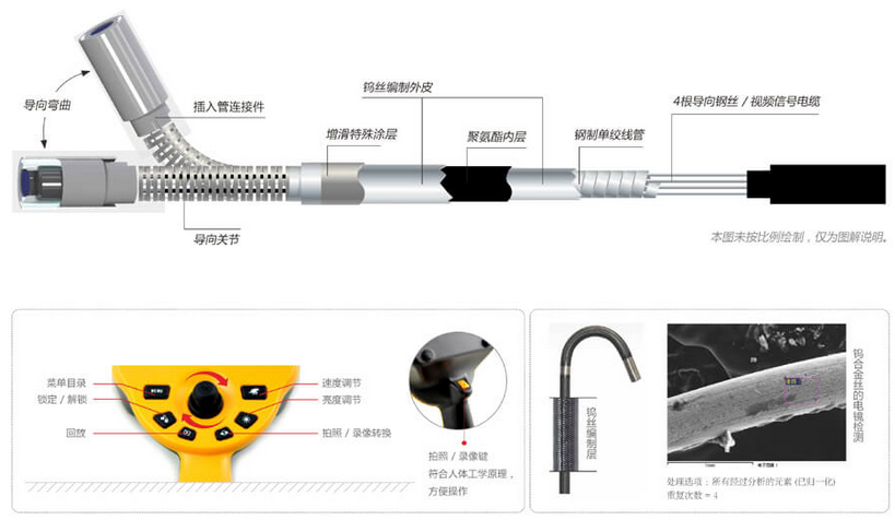 C50電控高清工業(yè)內(nèi)窺鏡采用新型雙鎢合金絲材料編制的四層插入管,比不銹鋼絲插入管擁有更為緊密的編織層,讓插入管的耐磨性能提高20倍,柔韌性能提升4倍,使用壽命與操作的靈敏性同時(shí)增強(qiáng)。