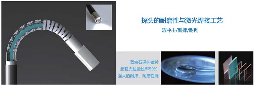 C50電控高清工業(yè)內(nèi)窺鏡、插入管的探頭部分使用具有高度耐磨性能的鈦合金,鈦合金所具有的耐磨強(qiáng)度是普通不銹鋼的100倍;為進(jìn)一步保護(hù)鈦合金探頭,采用了藍(lán)寶石保護(hù)鏡片,它的強(qiáng)度是普通石英石鏡片的8倍,鋼化玻璃的20倍,提升防沖擊、耐摔、耐刮性能,有效避免被檢設(shè)備的二次破壞。