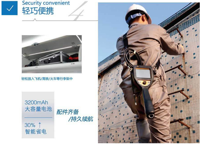 C50電控高清工業(yè)內(nèi)窺鏡運(yùn)用超輕設(shè)計(jì),整機(jī)(含電池)僅重1.45Kg,同時(shí)配備真皮肩包,安全、便攜,不論檢查環(huán)境是百米高塔上的風(fēng)輪機(jī)齒輪箱,還是復(fù)雜的大型機(jī)械,C50工業(yè)內(nèi)窺鏡都能夠得心應(yīng)手。
