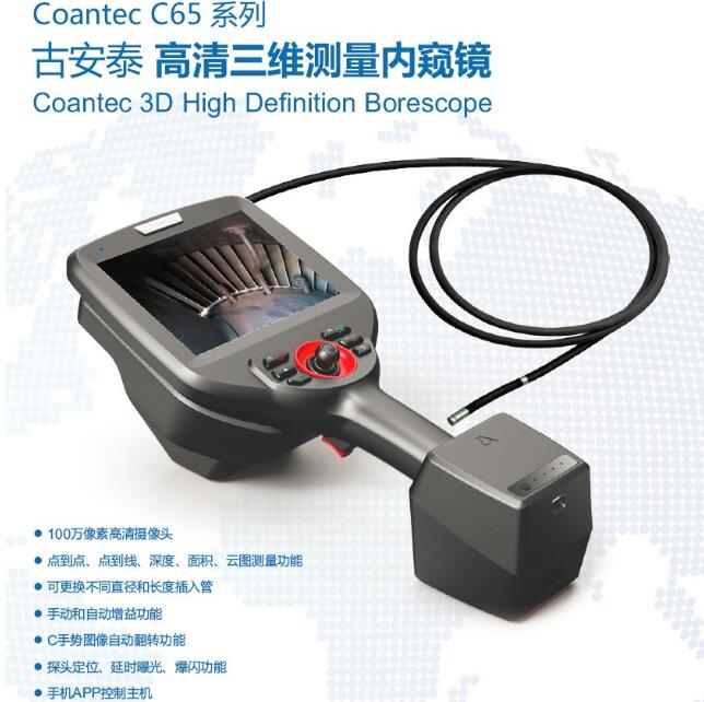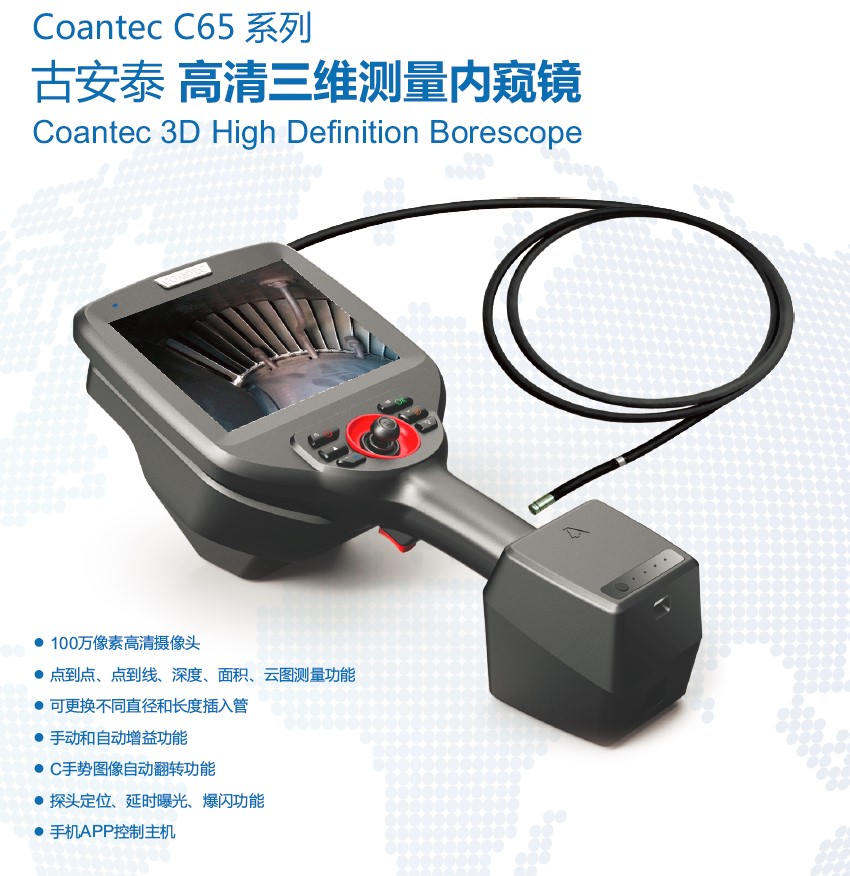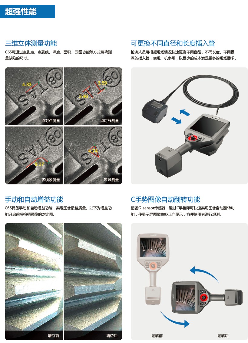 1、立體測量功能,C65可通過點到點、點到線、深度、面積、云圖功能等方式精確測量缺陷的尺寸;