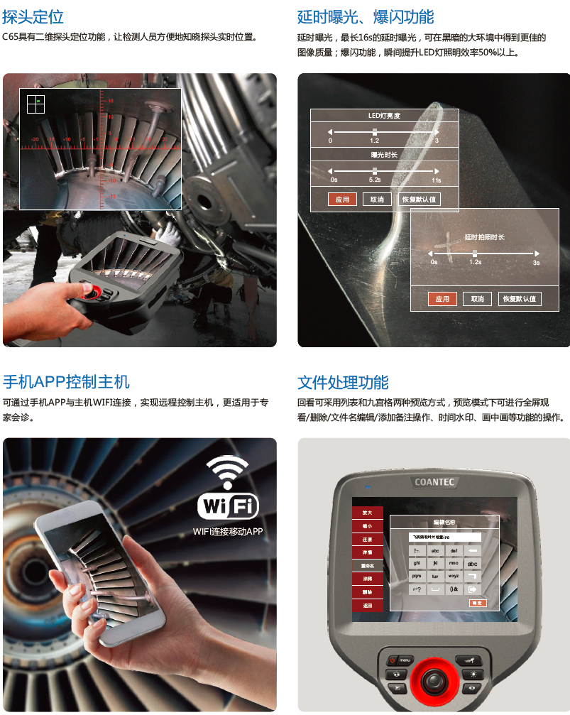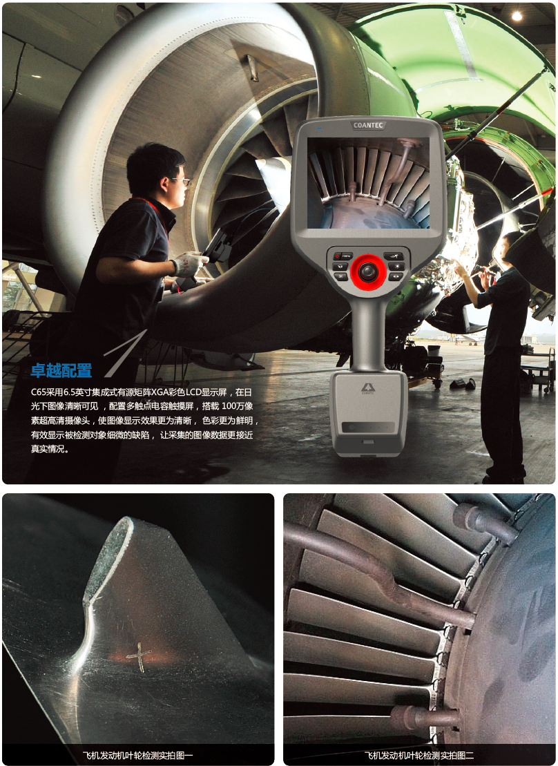 C65 采用6.5英寸集成式有源矩陣XGA彩色LCD顯示屏,在日光下圖像清晰可見 ,配置多觸點電容觸摸屏,搭載100萬像素超高清攝像頭,使圖像顯示效果更為清晰,色彩更為鮮明,有效顯示被檢測對象細微的缺陷,讓采集的圖像數(shù)據(jù)更接近真實情況。