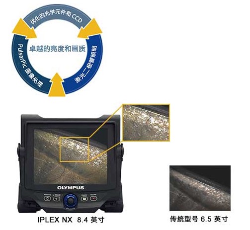 采用IPLEX NX觀察目標(biāo)區(qū)域比以前更清晰。三種增強(qiáng)技術(shù) – 改善的高分辨率CCD技術(shù)、先進(jìn)的激光二極管照明技術(shù)和新型的PulsarPic處理器 – 提供了的畫質(zhì),亮度是傳統(tǒng)工業(yè)視頻內(nèi)窺鏡的四倍。即使是大而寬的標(biāo)本也能照亮檢查目標(biāo)。