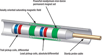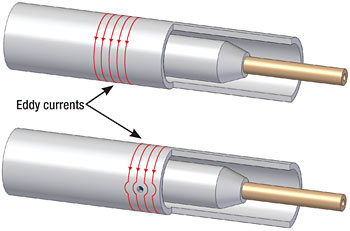 l 兩個線圈受電流激勵后在線圈周圍產(chǎn)生磁場。磁場穿過管件材料,在材料中產(chǎn)生相反的交流電。這些電流被稱作渦流。